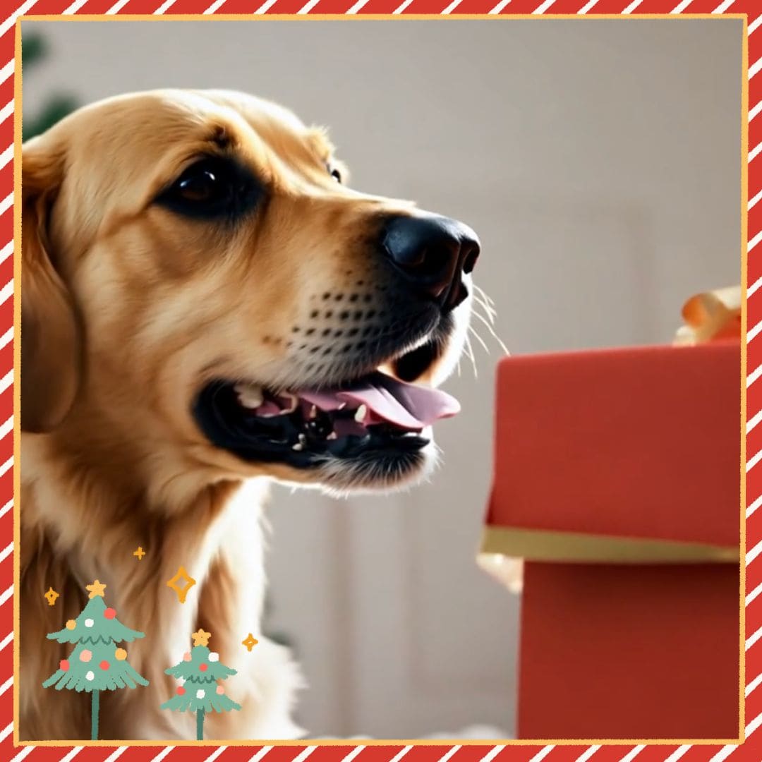 Gli porgi un pacchetto natalizio incartato con cura, e lui scodinzola emozionato mentre lo prende tra le zampe.